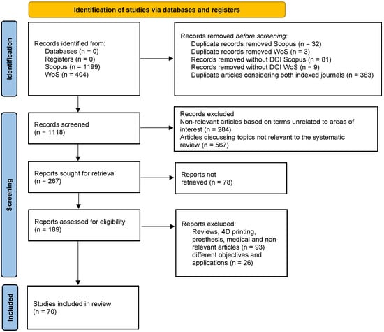 In the identification phase, 398 duplicate articles were removed. Additionally, 90 articles without a DOI were discarded. In the second phase, the screening stage, 851 articles were eliminated based on their title and abstract. These articles did not contain the keywords for additive manufacturing and smart parts, reducing the total to 267 articles. In the “reports not retrieved” stage, 78 articles were removed due to access and payment restrictions, which was a critical phase as some of these articles were of interest. Finally, in the “reports assessed for eligibility” stage, 119 articles related to topics such as reviews, 4D printing, medicine, and other irrelevant subjects, as well as those with different objectives and applications, were eliminated. In the end, 70 articles were included in the study. The summary and the flow diagram are shown in Figure 2.