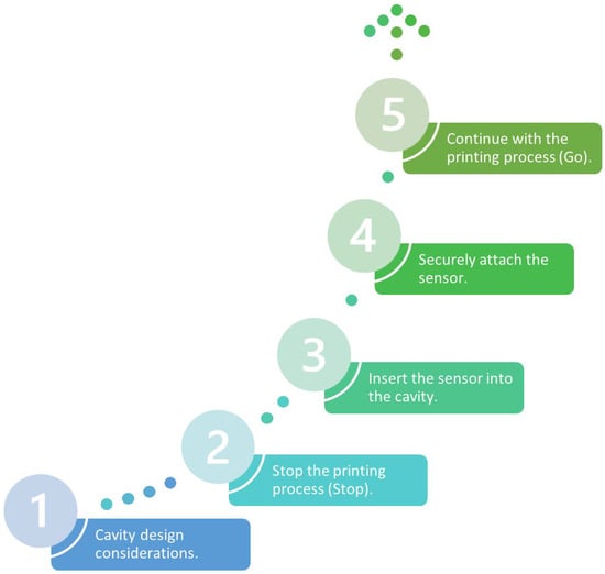 This technique cannot be applied in conventional processes because they are continuous processes and require accessories to introduce a sensor inside the part []. In addition to the above, the force of the flow in processes such as casting causes the sensor to lose its position, and it is often out of service []. However, there are difficulties in integrating sensors inside parts manufactured with AM; moreover, design and manufacturing aspects must be considered for a correct assembly. In summary, to be successful, the “stop and go” technique requires five stages as shown in the following Figure 3.