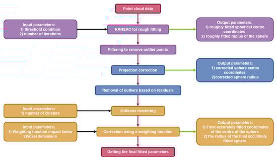 This section introduces the implementation process of PK-RANSAC, which is mainly divided into three steps: RANSAC rough fitting, projection filter correction, and precise determination of fitting parameters. In the RANSAC rough fitting process, preliminary fitting of the sphere parameters is performed. In the projection correction process, the correction value is obtained by considering two projections in opposite directions. In the process of accurately obtaining fitting parameters, fitting results are obtained through K-means clustering and a weighting function. The algorithm solution flow is illustrated in Figure 1.