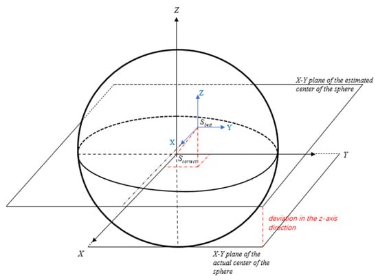 The correction values  and  in the X-axis and Y-axis directions can be obtained similarly. Then, the correction value  for all rough fitting sphere center coordinates can be obtained as shown in Equation (10).