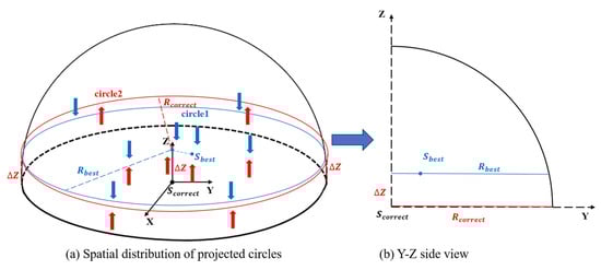 The spatial positions of the two two-dimensional projected circles are shown in Figure 3a. The red circle, circle2, is the projection formed by the point whose Z-axis value is less than the actual Z-axis value. The red arrow represents the upward projection process. The same is true for the blue circle, circle1. The upper part of the projection can be recorded as circle1 with a radius of , while the lower part can be recorded as circle2 with a radius of . Figure 3b presents a side view of Figure 3a, which more clearly shows the geometric relationships. The correction value  in the Z-axis direction can be obtained based on the geometric relationship in Equation (8).