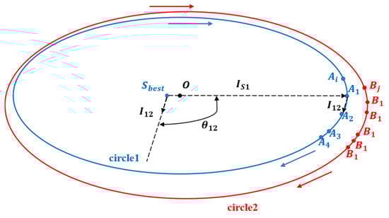 To obtain the circumscribed contour points of the two projected two-dimensional circles, we first select the point furthest from the rough estimate as the outer contour start point, which is denoted as . The furthest point from the center of the rough estimate sphere  must be on the outer contour. The vector pointing to the point  from the center of the sphere is denoted as . In these circular point cloud data, we consider the initial direction to each point to be a vector  and determine the point  that minimizes the angle between the vectors  and . We denote this angle as , which can be derived from the angle between the two vectors, as shown in Equation (9).
