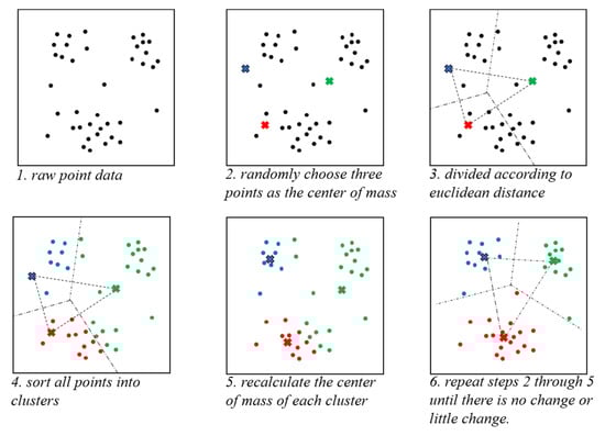The concept of K-means clustering is to select K samples from a set of clustered samples, and then traverse all samples and calculate the distance between each sample and the K samples. The sample is classified into the category with the smallest distance. In this manner, all samples are assigned to their respective categories. The centroids of the samples in the K categories are then recalculated and the algorithm returns to the first step to continue iteration, repeating the above steps until the centroids of the samples in the K categories no longer move or move very little. Figure 5 illustrates the implementation process of this clustering algorithm.