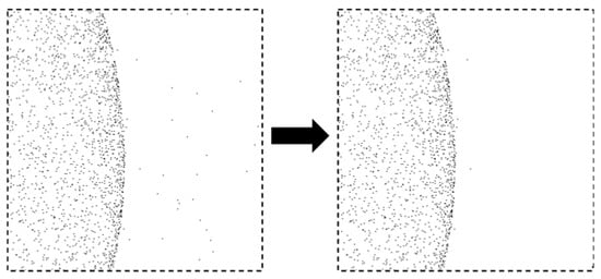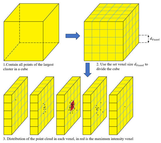 The distribution of the point cloud in the largest cluster is still dense in the center. Therefore, we process the largest cluster. Specifically, we predefine the parameter , divide the coordinate value of each point by the minimum voxel value and round it, multiply it by the parameter value, and then add one to the value of the voxel to which the point belongs. A conceptual visualization of this process is presented in Figure 6. The closer the voxel value is to the actual center of the sphere, the larger the voxel value and the more voxels have non-zero values. Therefore, we select the voxel with the largest value as the maximum-intensity voxel, set the distance weight W in Equation (16), and weight the voxel according to the distance weighting function. The parameter d represents the Euclidean distance from each point to the center of the maximum-intensity voxel. In this manner, both the weight of the dense area and the influence of the coordinates of the surrounding sparse points are considered.