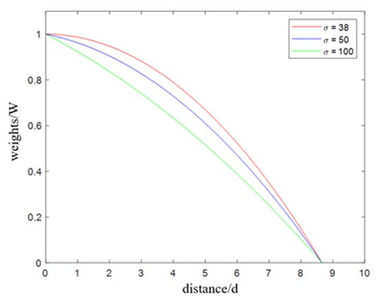 Effect of the parameter σ on the decay of weights (the ordinate is the weight value, and the abscissa is the distance from each point to the maximum-intensity voxel).