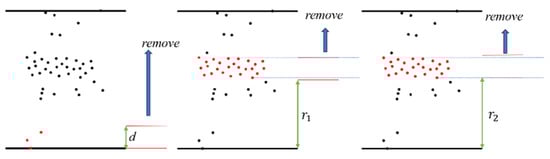 In the formulas above, the parameter  is used to control the attenuation rate. Combined with the information in Figure 7, one can see that the larger the value of , the faster the weight decays. After the corrected sphere center coordinate value is obtained according to the distance-weighted formula, the sphere radius is obtained as shown in Figure 8. The steps are to set the interval width d and start from the point closest to the fitting sphere center coordinate and move outward from the sphere until the number of points in the interval is maximized, and the distance is recorded as . When the number of point clouds in the red interval in the figure decreases, the distance is recorded as . The radius  calculation formula is defined in Equation (17). The purpose of this step is to obtain accurate fitting parameters. The corresponding pseudo-code is presented in Algorithm 2.