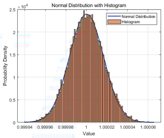 We first generated a spherical point cloud through simulation and then used the point cloud data to perform geometric parameter fitting experiments. The spherical point cloud consisted of 25,000 points, of which 2000 were interference points. The deviation between the Euclidean distance from other points and the center of the sphere, and the set radius was within 0.005%. The preset center coordinates and the positions of all points were randomly generated, and the deviation from the points to the preset sphere surface followed a normal distribution, as shown in Figure 9. The blue curve in the figure is a normal distribution curve, and the orange bars form a distribution histogram of the deviation.