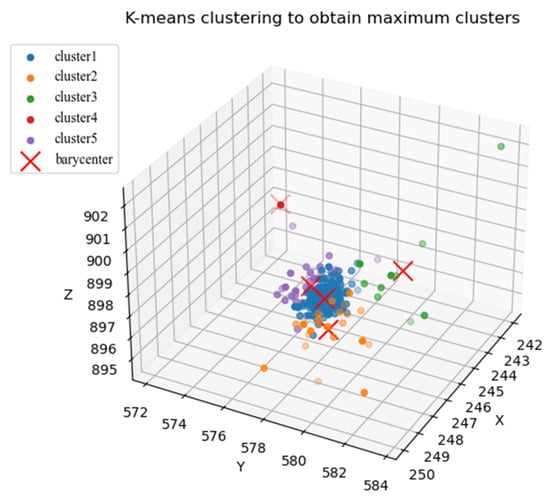 Through the projection filtering operation in the second step, the sphere center correction distance was obtained. Then, the distance residual from each point to the corrected sphere center was calculated, and 0.27% of the points were eliminated according to the residual size and three-sigma rule. The value of 0.27% was obtained according to the normal distribution. After sampling fitting, the fitted sphere center point set was obtained. Through K-means clustering, the fitted sphere center points were improved and divided into five categories. Figure 11 presents the clustering results, where the blue cluster is the largest cluster identified through clustering.