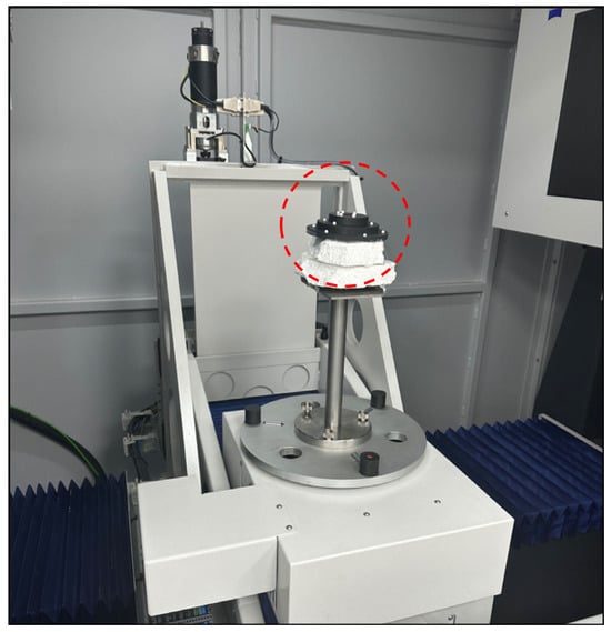 The true values of the geometric parameters for the real CT experiment were measured using a high-precision CMM F25 instrument from the China Academy of Metrology and Science, which has a measurement accuracy of 0.25 μm. The actual raw projection data were obtained using a high-precision X-ray tomography machine. The principle of CT measurement is based on the different attenuation coefficients of materials for X-rays, and images are reconstructed using multiple projection images of X-rays passing through the detector from different angles of the object under test. The first measured CT dataset was collected from a cylinder-ball reference object, where the ball was made of a different material than the cylinder. The main purpose of this experiment was to evaluate the performance advantages and disadvantages of the PK-RANSAC fitting algorithm for determining the radius. The second CT dataset consisted of a stepped ball-plate standard, comprising a black carbon brazed dimensional sphere plate with 15 white ceramic spheres. This experiment aimed to evaluate the merits of PK-RANSAC in terms of fitting spherical coordinates by optimizing the fitting of the spherical centroid distance parameter. The stepped ball-plate standard was fixed to the instrument as shown in Figure 12. The radii and coordinates of the spheres, as well as the sphero-centric distances between spheres, were obtained by fitting the geometrical parameters of the 15 spheres.