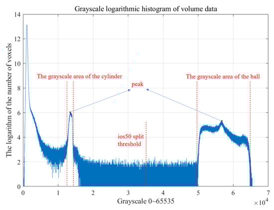 For the cylinder-ball reference object experiment, the projection data were reconstructed, and the reconstructed volume data slices are presented in Figure 13. All voxel values of the reconstructed volume data are in the grayscale range of 0~65,535. Figure 14 presents a logarithmic intensity histogram of the volume data voxels. The horizontal axis represents the grayscale value, and the vertical axis is the logarithm of the number of voxels corresponding to the grayscale value. The first peak area represents the grayscale value of the cylinder, while the second represents the grayscale value of the sphere. Based on ios50, threshold segmentation was performed to derive the median of the grayscale values corresponding to the two peaks and use this value as the segmentation threshold. The mesh model and point cloud were obtained using the gridding algorithm. Because the adhesion of the lower half of the sphere to the cylinder affects the fitting process of the sphere, the cropbox filter was used to remove the adhesion area. The experimental results are presented in Table 4, according to which the PK-RANSAC fitting value is closer to the true value compared to the RANSAC fitting value.