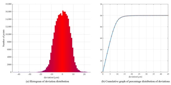 To verify the performance of PK-RANSAC further, the deviation from each point to the surface of the fitting sphere was calculated after fitting. The formula for the sphere center deviation is defined in Equation (18), and a distribution histogram of the deviation and percentage accumulation diagram of the deviation are presented in Figure 15. Figure 15a reveals that the distribution of the deviation is somewhat similar to the normal distribution in shape, and the smaller the absolute value of the deviation, the more points are distributed. In Figure 15b, one can see that points with a deviation within 10 μm account for 90.204% of all points.