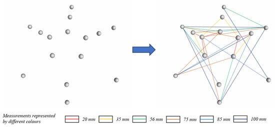 Fifteen spheres and thirty sphere center distances (different colors represent different values).