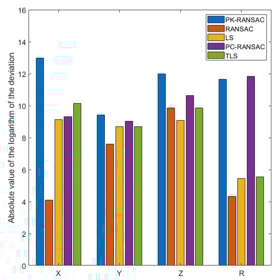The fitting results for the simulation data are presented in Figure 17. To show the performance differences between different algorithms clearly, the deviation values are presented in the form of logarithmic absolute values as the ordinate. This visualization amplifies differences in deviation, highlighting slight differences in algorithm performance. The larger the value of the ordinate, the closer it is to the set true value. PK-RANSAC provides significant advantages for fitting the two key parameters of the sphere center coordinates and sphere radius. Specifically, for both parameters, the deviation values of PK-RANSAC are significantly smaller than those of the other four methods, demonstrating that it has greater stability and accuracy when handling complex point cloud data. In contrast, although TLS and PC-RANSAC exhibit obvious improvements in terms of handling outliers and noise compared with LS and RANSAC, PK-RANSAC still provides superior fitting accuracy. This demonstrates that PK-RANSAC improves overall performance by combining the advantages of RANSAC and projection filtering, providing outstanding performance in complex environments. Overall, these results indicate that the application of PK-RANSAC to industrial CT measurement has great potential and can provide a more reliable solution for spherical point cloud fitting.