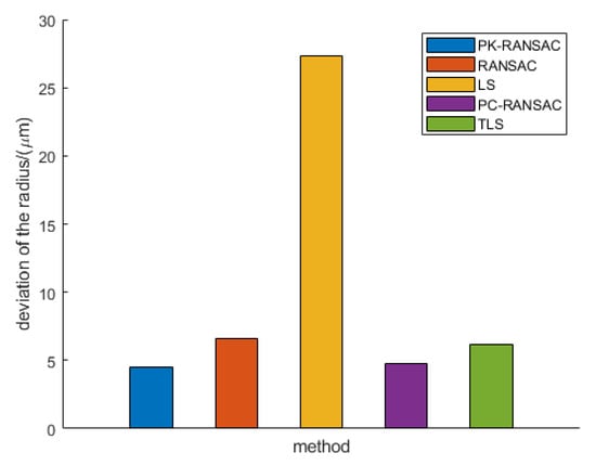 In the CT cylinder-ball reference object experiment, we considered the same five methods to conduct a comparative analysis of the parameter of sphere radius. Figure 18 presents the deviations of the five point cloud algorithms when fitting the radius compared with the true value. The ordinate represents the deviation between the fitting radius and the true value. The smaller the value, the closer the fitting result is to the true value, indicating better performance. There are inevitable errors in the reconstruction process of CT, and certain deviations are introduced in the conversion from reconstructed volume data to a mesh model. However, the mesh model used by all fitting algorithms is the same, so each method has the same inherent deviation between the fitted radius and true value. This deviation can be considered a constant, so the closer the fitting result is to the true value, the better the performance of the algorithm. PK-RANSAC provides the best radius fitting performance with the smallest deviation, demonstrating excellent fitting accuracy and robustness. In contrast, the LS method is easily affected by outliers, and the fitting results contain large deviations, demonstrating the disadvantage of insufficient robustness. Additionally, although RANSAC, PC-RANSAC, and TLS improved fitting accuracy to a certain extent, they still failed to surpass the superior performance of PK-RANSAC. These results demonstrate that PK-RANSAC can effectively reduce the deviation introduced by noise and outliers when processing complex CT cylinder-ball reference object data, yielding a fitting radius close to the true value. This performance improvement is of great significance for the precision of CT measurement, especially in industrial applications that require high-precision fitting. Based on the results of our comparative analysis, it can be concluded that PK-RANSAC provides significant advantages for sphere radius fitting and is superior to the other four methods in terms of fitting accuracy and robustness, demonstrating that PK-RANSAC is not only advanced in theory but also exhibits good applicability and reliability in practical applications.