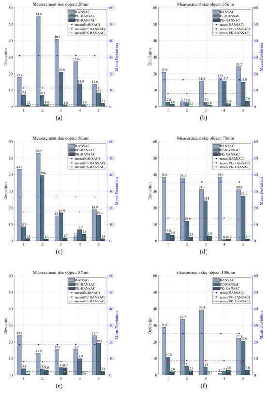 Measurement object size. (a–f) represent fitting experiments for six values and thirty spherical center distances. The vertical and horizontal axes represent deviations and spherical center distances, respectively, and the unit of deviation is μm.
