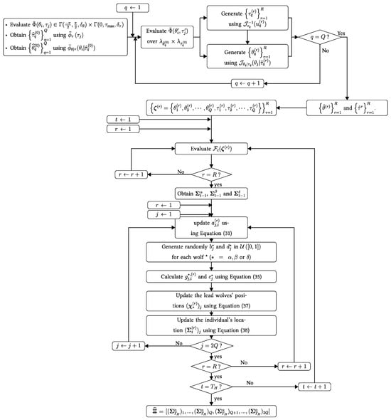 - Step (1.a) [GWO]: The conventional GWO initially places the wolves pack of individuals at random positions in the search space where and . Hence, it requires larger packs and longer hunting (iterations) to catch the prey, i.e., find the correct angles of arrival (AoAs) and time delays (TDs) without guaranteeing global convergence.