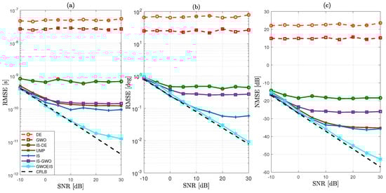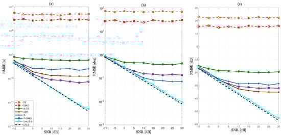 In Figure 3 and Figure 4, we evaluate the RMSE/NMSE performance versus the SNR to compare the new GWOEIS solution against the Cramér–Rao lower bound (CRLB) of [], the UMP algorithm in [], the classic GWO in [], the classic DE [], the IS technique in [], IS-DE that simply combines DE with IS in [], and another benchmark version developed here by simply combining this time IS with GWO, referred to as IS-GWO.