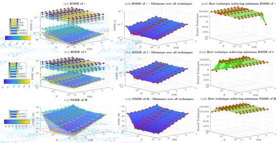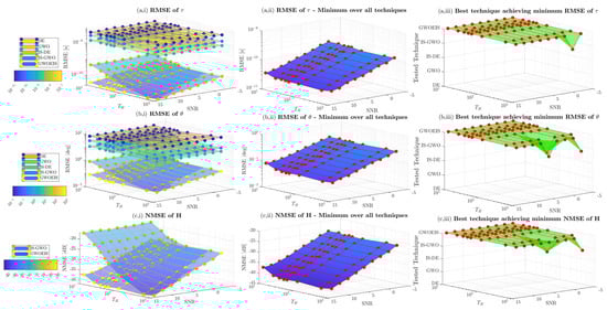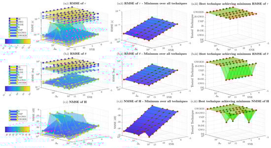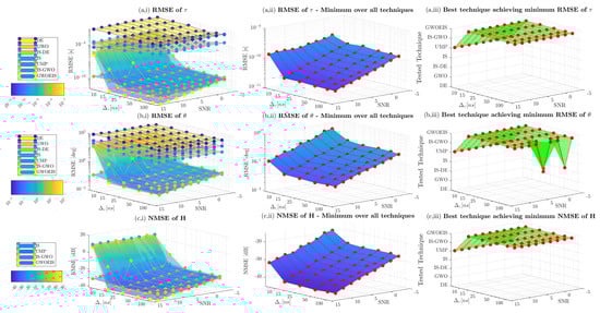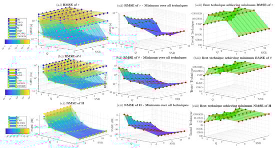 In Figure 5(a,i,b,i,c,i), we assess the estimation performance of the TD, the AoA, and the channel, respectively. GWOEIS, IS-GWO, and IS performs better than DE, GWO, and IS-DE. Figure 5(a,ii,b,ii,c,ii) show the minimum RMSE over all techniques for TD, AoA, and channel estimation, respectively. The RMSE decreases when R and SNR increase. In Figure 5(a,iii,b,iii,c,iii), we can see that GWOEIS achieves the best performance in terms of TD, AoA, and channel estimation over and all SNR values. IS, IS-GWO, GWO, DE, and IS-DE can not match the performance of GWOEIS, even with , but at the expense of significant increase in computational cost.
