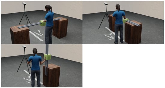 A test subject is positioned 1.3 m frontally in front of an AK. The angle between the subject and the RGB-D camera is kept constant during the test. The AK is aligned to a height of 1.80 m and a downward inclination of 30°. A linear guide (LG) with a movable device, on which the hand is later placed, is positioned directly in front of the subject. The palm of the hand is kept open and the fingers extended during the test. To ensure uniform hand positioning, a negative impression of the subject’s hand was created using commercially available mounting foam and colored black to minimize reflections. The height of the upper edge of the LG is 1.20 m. The experiment is conducted with one subject (gender: male; age: 35 years; height: 1.73; weight: 76 kg). In order to realize the three directions of movement with one LG, the test setup is modified in the course of the experiment. For this purpose, the LG is reorganized according to the x-, y- and z-axis. The relative distances, as described above, are retained. The camera position remains unchanged. Figure 1 shows the test setup with the respective positioning of the LG depending on the direction of axis movement.