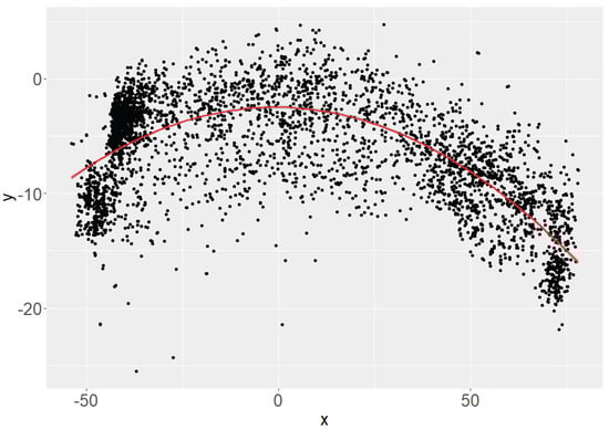 Exemplary distribution of the measured positions of joint (15) of the x- and y-axis with quadratic regression function (red curve).