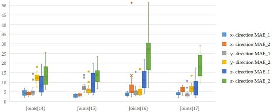The results show that the joint (15) (right hand) has the lowest variance for all the test series carried out. If the linear guide is aligned in the X direction, the Y and Z positions should ideally remain stable, as the joints to be observed are firmly connected to the guide. In this arrangement, movement is only possible in the X direction, while the other axes should ideally show no deviations from the initial value. The same principle applies if the guide is aligned along the Y or Z axis; only the movement along the aligned axis should take place, while the values for the others should remain constant. Based on the average of the s and the corresponding standard deviations (SD) for the axes, which should remain constant, it is found that the average error is the smallest when the movement is in the X direction, indicating better detection. Conversely, the average of the errors is highest for movements in the Z direction, which indicates lower detection accuracy. This trend is visually confirmed by the box plots, which clearly show the differences in accuracy between the different directions of movement. These results are also supported by the subsequent analyses with different parameters. Overall, the joint (15) exhibits the highest precision and accuracy of the joints tested. The highest inaccuracy is found at joint (16) (fingertip on the right) (see Figure 4).