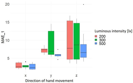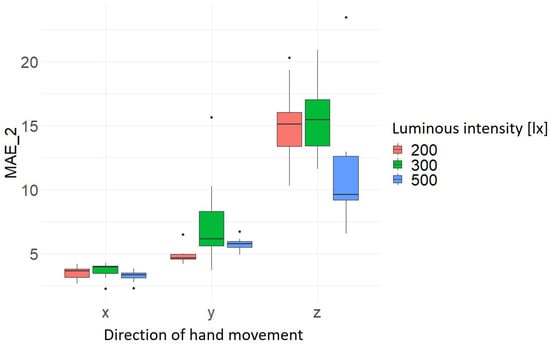 In the following, the influence of the independent variables is evaluated using joint (15). For this purpose, boxplots are created to visualize the distribution of the values of _1 and _2 in relation to the hand movement direction as a function of light intensity, hand movement range and hand movement velocity. The present results show that the highest measured accuracy and precision of 2.64 mm ± 0.84 mm is achieved at a light intensity of 500 lx. Furthermore, it can be seen that the results for the light intensities of 200 lx and 300 lx are almost identical overall in terms of accuracy. However, the precision varies to different degrees depending on the direction of hand movement, as can be seen by comparing Figure 5 and Figure 6 and Table 5. Table 5 summarizes the results of the average values of the s (mean) and standard deviation (sd) for _1 and _2 as a function of the hand movement and luminous intensity.