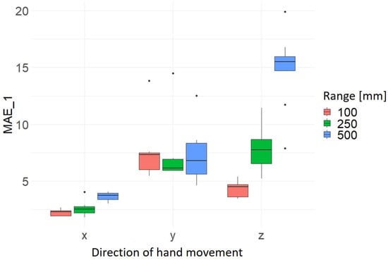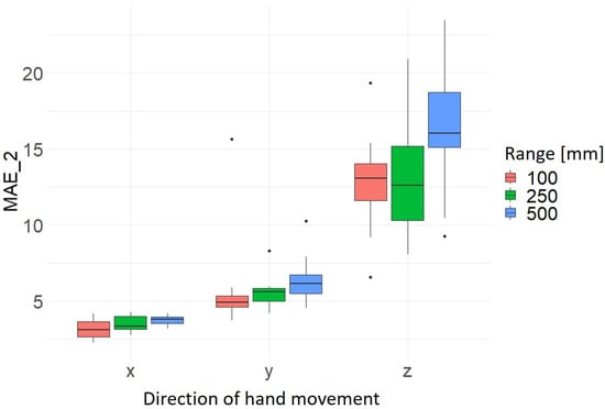 The results for the hand movement range show noticeable that in most cases the average s are highest at 500 mm. This means that the deviation of the normally constant values of the axes not in motion is the greatest on average across the 10 trials for each direction and range. Thus, the highest accuracy and precision for a movement range of 100 mm is measured at 2.24 mm ± 0.30 mm. It can also be seen that the results for the x-axis direction of movement are the most precise. As previously stated, the greatest deviation is recorded in the z-axis movement direction for a movement range of 500 mm at 16.20 mm ± 0.40 mm (see Figure 7 and Figure 8 and Table 6). The calculated average values and the corresponding standard deviation for _1 and _2 of the hand movement directions and hand movement ranges investigated are summarized in Table 6.