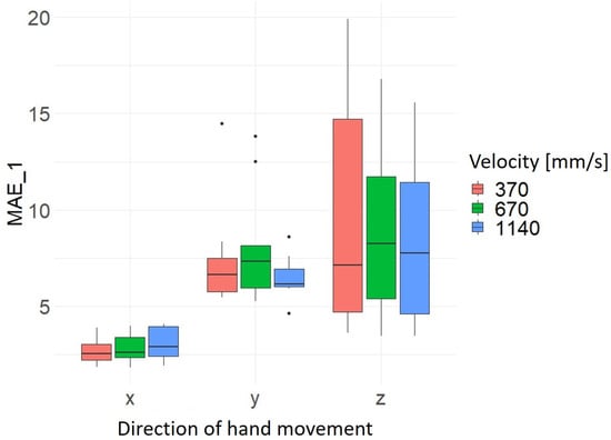 With regard to hand movement velocity, there is no clear pattern in terms of speed-dependent precision or accuracy. However, the results confirm the finding already mentioned above that the hand movements in the x-axis direction have the highest precision and accuracy and in the z-axis direction the lowest precision and accuracy with regard to the hand movement direction (see Figure 9 and Figure 10). However, the significantly lower scatter of the data sets for the hand movement in the x- and y-axis direction is clearer here. The results of the average values and standard deviation for _1 and _2 as a function of hand movement direction and hand movement velocity are summarized in Table 7.