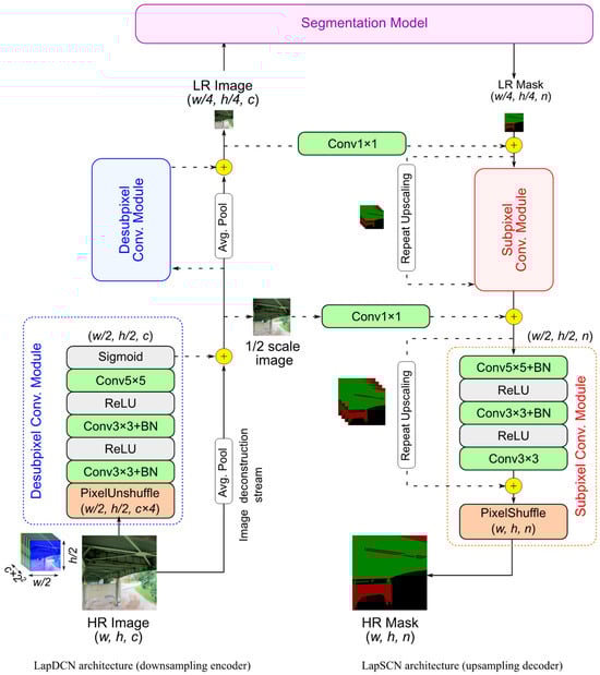 The downsampling encoder and upsampling decoder are called Laplacian Subpixel Convolutional Network (LapSCN) and Laplacian Desubpixel Convolutional Network (LapDCN), respectively (Figure 3). These networks can progressively rescale images or masks based on a cascade of subpixel convolutional modules. LapSCN has a mask reconstruction stream comprising a set of feature extraction modules with residual learning, while LapDCN has an image deconstruction stream accompanied by its own feature extraction modules. At each stage, the feature extraction modules process the input data to predict lower- or upper-scale residuals. These residuals are then added to the resized data in the deconstruction or reconstruction stream, refining the output. The output of these streams can be used as the final resized output or can undergo further scaling by re-entering the feature extraction modules.