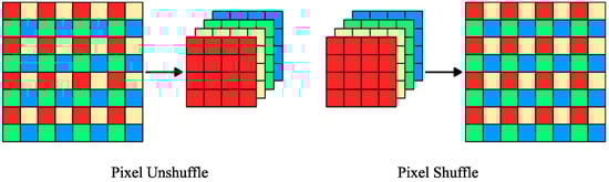 On the other side, LapDCN has desubpixel convolutional modules that start with downscaling the input image using a pixel unshuffle operation, a reverse of the pixel shuffle operation, followed by three convolutional blocks, that ends with a sigmoid activation (left side of Figure 3). By rearranging the pixels along the channels’ axis, the pixel unshuffle layer significantly reduces the computational cost without loss of information (Figure 4). Pixel unshuffle transforms a high-resolution image (w, h, c) to a twice-downscaled version (w/2, h/2, c × 4) with four times more channels. At the first convolutional layer, the computational savings obtained from downscaling the image are offset by the expenses due to the expansion of channels. However, substantial net computational savings are achieved in the subsequent convolutional operations as a result of the downscaling operation. Finally, the input image is downsized in the image deconstruction stream using adaptive average pooling before adding the residuals from the feature extraction module. Details regarding the filters of the convolutional layers of the feature extraction modules of both LapDCN and LapSCN are presented in Table 1.