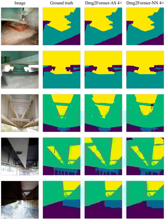 Table 4 shows the class-average evaluation metrics of the 224-sized Dmg2Former with the Swin encoder initialized using ImageNet weights provided by the original authors of Swin Transformers. The ImageNet initialization of the Swin encoder resulted in noticeable improvements across all metrics for all 224-sized models. Overall, using adaptive rescalers has allowed for a slight increase in the evaluation metrics, with Dmg2Former-AR 2× achieving the best results. However, non-trainable rescalers (Dmg2Former-NN 2× and Dmg2Former-NN 4×) slightly deteriorated the model performance compared to the low-resolution segmentation model (Dmg2Former). It is worth noting that the differences in performance are subtle, and for this dataset, the use of interpolation-based resizers should not drastically impact the prediction results. Additionally, class-wise IoU results presented in Table 5 show a balanced class-wise prediction. Figure 5 visualizes example predictions of Dmg2Former-AR 4× and Dmg2Former-NN 4× side-by-side with the ground truth masks.