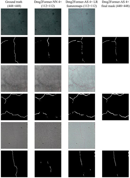 Insights into the Dmg2Former-AR inference process. From the left, the ground-truth images and masks containing cracks at 448 × 448, the output of nearest-neighbor and LapDCN downsampling images by a factor of four (top) and the corresponding masks of Dmg2Former at 112 × 112 (bottom), and the LapSCN-upscaled mask at 448 × 448.