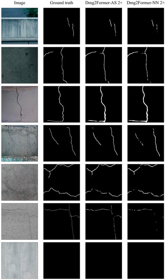 Crack segmentation sample test images and their Dmg2Former-AR 2× and Dmg2Former-NN 2× predictions. Encoders were initialized with ImageNet-pre-trained weights.