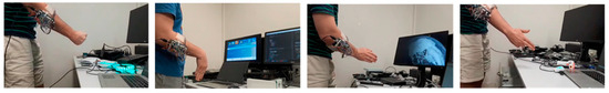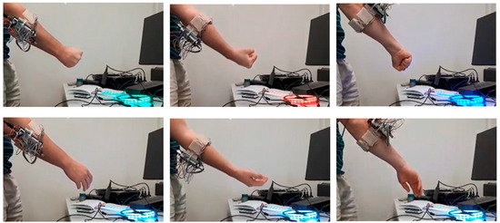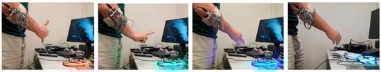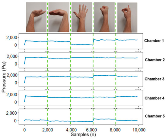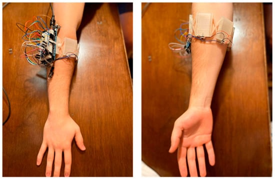 Hand/arm gesture recognition is utilised in a diverse range of topics including prosthesis control, human–computer interaction systems, sign language recognition, musical creation, robotics control and entertainment/virtual reality interfaces [,,,,]. The methods employed to recognise gestures include motion tracking, computer vision, electromyography (EMG) [], force myography (FMG) [,] and mechanomyography (MMG) []. This work uses a custom-built pressure-based force myography (pFMG) method to acquire user intent [].