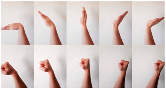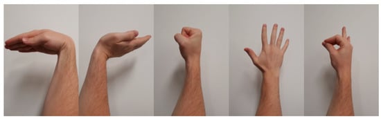 As shown in Figure 3, five common gestures (Fist, Pinch, Spread Fingers, Wave In and Wave Out) were selected to test the effectiveness of the gesture recognition system. These gestures were selected for a number of reasons, the main one being that they are relatively prevalent in the myography-based gesture recognition literature. These gestures are frequently cited as possessing the following desirable characteristics [,,]: