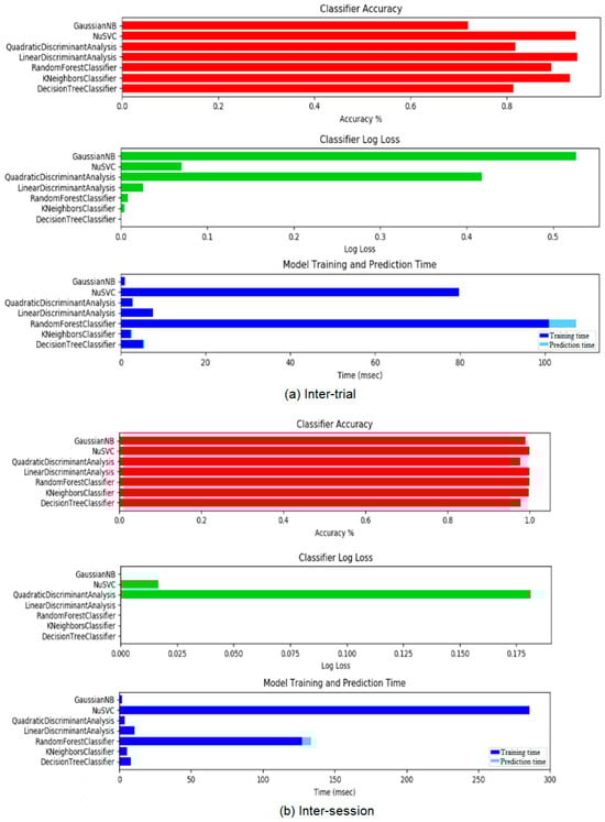 Similar to the protocol used in our previous work [], the test pool of classifier models started with Decision Tree, Random Forest, k-Nearest Neighbour, Linear Discriminant Analysis (LDA), Quadratic Discriminant Analysis (QDA), Nu-Support Vector Classification (NuSVC), and Gaussian Naïve Bayes (refer to [,] for further details). These classifier models are well developed in the existing literature and have substantiative documentation for their implementation.