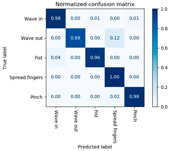 An EMG-based framework [] claimed to achieve a greater recognition accuracy of 86% using the Myo armband and the same five gesture classes. This framework utilised k-Nearest Neighbour and dynamic time-warping algorithms as part of their machine learning model structure. Their study utilised 10 participant subjects and obtained a training set of 10 s of data per gesture. The gesture recognition system worked in real-time and was able to produce gesture predictions every 250 ms on average.
