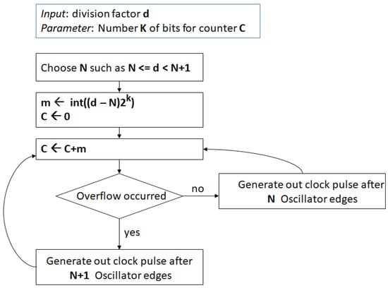Assuming bits for the cycle counter that must count up to M, the channel spacing turns out to be approximately , lower than in the former implementation. The drawback of this method is that the clock division for either or can last for a large number of cycles introducing a periodic drift in the output clock frequency, even if maintained at the right average frequency. It is better to evenly distribute the clock division for either or , with the division by occurring with probability . This can be easily achieved with a technique similar to the previous method, i.e., considering a bits register and adding at every cycle. When an overflow occurs, the clock division by is performed; otherwise, the oscillator clock is divided by N. The algorithm is summarized in the flowchart in Figure 1.