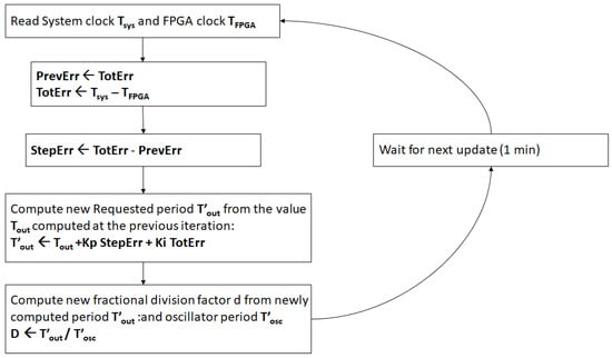 In addition to the output clock, the actual value of the 64-bit time counter is mapped against two output 32-bit registers: TimeOutHi and TimeOutLo. These registers are read and written by the software process via Linux ioctl() calls. Both the time counters difference accumulated since the start of the process execution and since the last correction performed are computed and stored in variables TotErr and StepErr, respectively. At every iteration, occurring every 1 or 2 s, the requested clock period is computed starting from the previous value as follows: