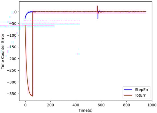 During the first 60 s, and therefore TotErr is left uncontrolled, while StepErr is used to correct the FPGA clock frequency every second. Afterwards, the time counter is set to the current system time (i.e., TotErr is set to 0) and the update is performed every 2 s in order to give more time for accumulating errors. The values of and are set to 0.048 and 0.04, respectively. As shown in Figure 3, after a certain period during which StepErr and TotErr stabilize around 0, a sudden increase in their values occurs due to the adjustment of the system clock carried out by NTP. The performed correction then progressively adjusts the FPGA output clock so that StepErr and TotErr gradually approach 0 again, without any bump in the generated frequency and any discontinuity in the FPGA time count. When the new value has been derived, the parameters m and N are computed and transferred to the input registers via ioctl() calls. N is chosen such that ) where e and are the periods of the output and of the oscillator clocks, respectively. m is then set to the integer part of