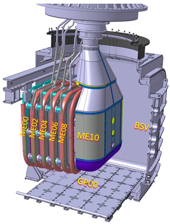 CAD view of the MITICA BS Mockup installed inside the MITICA Beam Source Vessel (BSV). MExx are the Mockup Electrodes at the different potentials from ground (ME00) to −1 MV (ME10) and connected to the High Voltage Bushing (HVB); the Ground Plate (GP00) is also visible on the bottom.