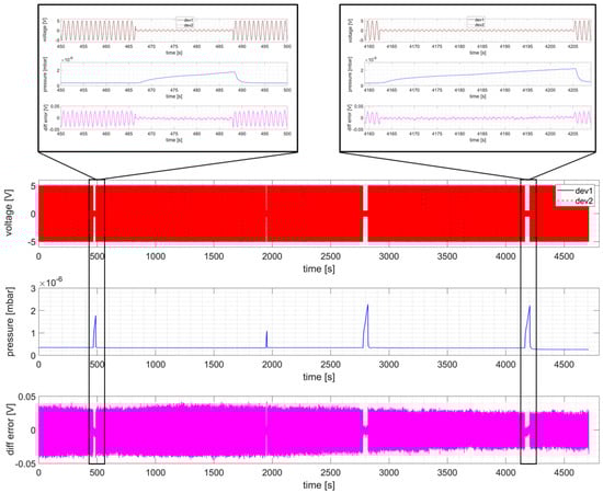 NBTF on-site test measurement during a dummy shot. Recorded voltage (Vpk = 5 V, f = 1 Hz sine) on two different RP devices (top panel), pressure measurement recorded on NTP device (center panel), and voltage difference between the two RP (bottom panel).