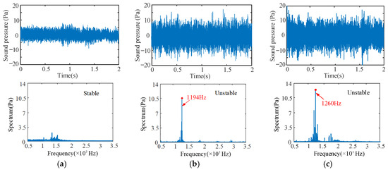 Figure 10 shows the samples of the measured sound pressure signals under different cutting conditions. The spindle speed is 600 rpm and the limit cutting widths are 0.5 mm and 2 mm in Figure 10a,b. The spindle speed is 700 rpm and the limit cutting widths is 3 mm in Figure 11c. The spindle speed is 1400 rpm and the limit cutting widths are 2 mm, 3 mm and 4 mm in Figure 11d–f. The time domain and frequency domain signals of the sound pressure signals are analyzed.