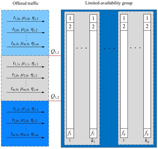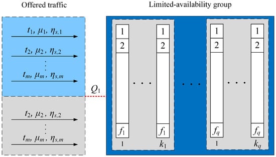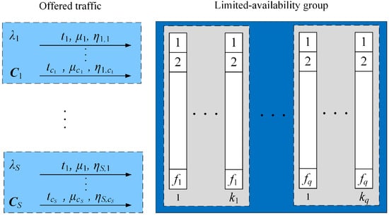 The group presented in Figure 1 offers Erlang traffic streams. The given traffic stream s is generated by sources that belong to the appropriate set of traffic sources . The system defines S sets of traffic sources that generate Erlang traffic streams. The sources belonging to the set can generate calls from the set according to the available set of services.