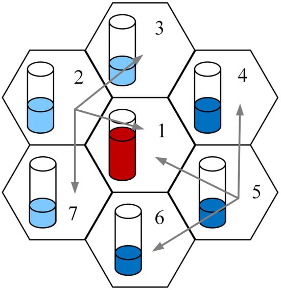 A cluster of cells equipped with a connection handover mechanism can be conceptualized as a system designed to optimize connection arrangements within a specific cell, maximizing the utilization of group resources [,]. Figure 4 illustrates a set of seven chosen cells, each featuring a symbolic vessel reflecting the radio interface load level. Cells 1, 2, and 4 exhibit higher loads. The handover mechanism facilitates the redirection of incoming calls, which cannot be accommodated in cells 1, 2, and 4, to neighboring cells—such as from cell 2 to cells 3 and 7. This system’s operation reflects that of a limited-availability group, where an individual cell corresponds to a subgroup within the group. If a specific subgroup (cell) cannot manage a connection, but there are ample resources in other subgroups of the group, the connection is directed to one of those suitable subgroups.