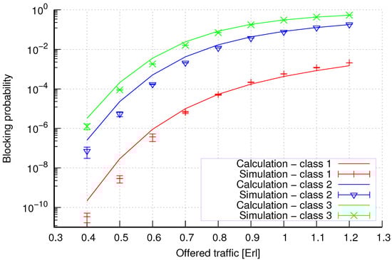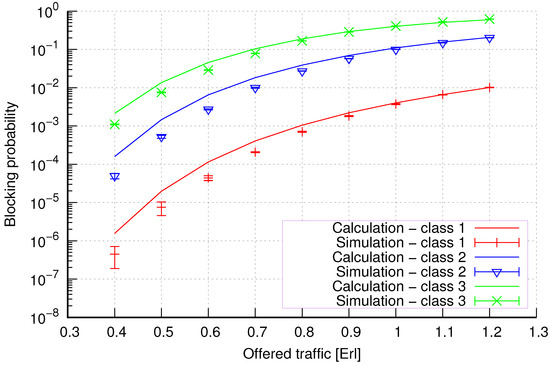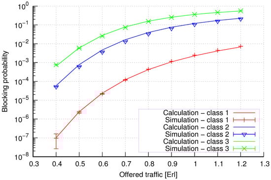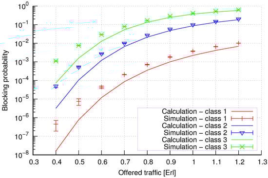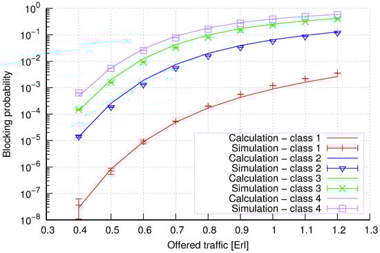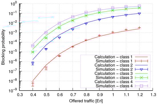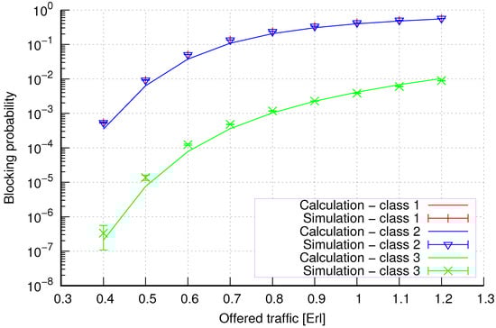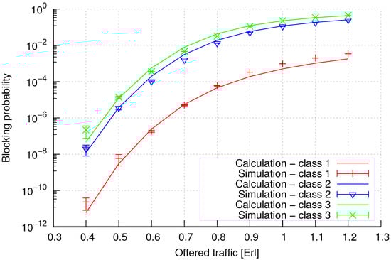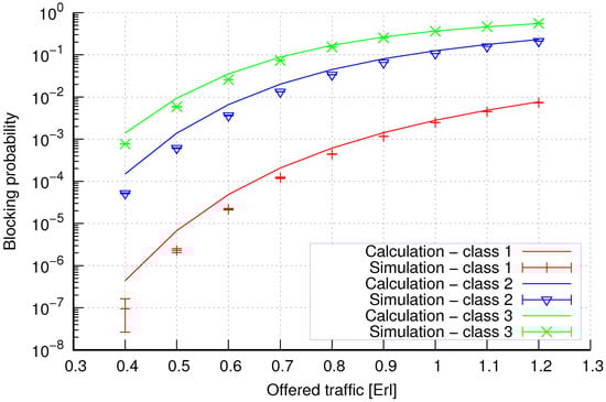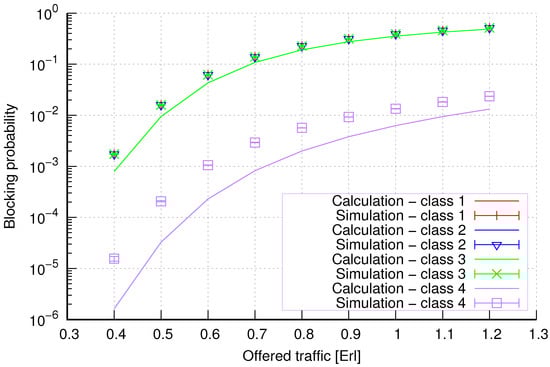 Figure 5 presents the blocking probability results in group 1, calculated using method 1. Greater calculation accuracy is achieved for higher system loads, regardless of the traffic class.