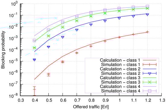 Figure 20 presents the blocking probability results in group 2 with the threshold mechanism calculated using method 2. Compared to the results presented in Figure 19, we obtain lower accuracy results for lower system loads and all traffic classes.