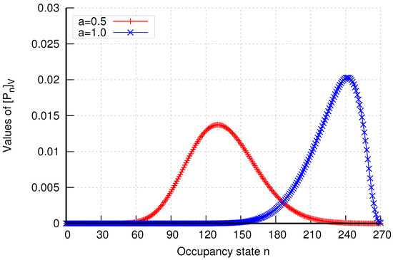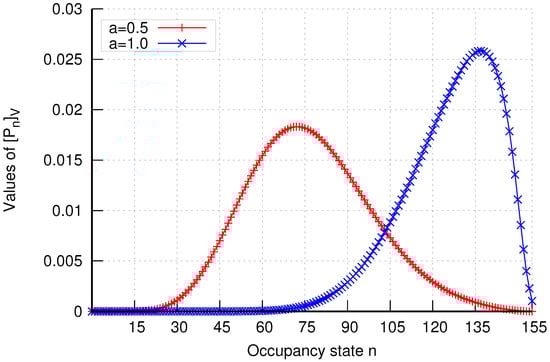 Additionally, the analytical model enables the determination of occupancy distributions in assemblies of cells. The results of occupancy distributions in two selected cell assemblies ( and ) are presented in Figure 23 and Figure 24. The system’s occupancy distribution allows us to ascertain the most likely load states of the system. Thus, by observing the peak of the graph, we can determine the extent of the system’s load.