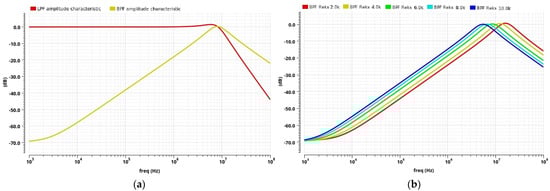 A TT-biquad filter is first designed with a center frequency of 8 MHz (to compare with the conditioner discrete realization results), where the ideal RC component values are calculated from (3). The filter quality factor value of 1 (Q = 1) is chosen as a compromise since the high-quality factor value increases the filter’s selectivity but deteriorates the other filter parameters. Higher Q factor values give rise to higher sensitivity of the filter gain at the band-pass center frequency to PVT variations. The filter’s sensitivity linearly increases with the quality factor value (4), and the final ωt influence is proportional to the filter Q factor value. The filter gain at the band-pass center frequency is set to 1 (A(ω0) = 1 or 0 dB) by using (5), and it also minimizes dependence on PVT variations. As previously mentioned, besides the band-pass configuration used in this paper, the proposed filter can also be used as a low-pass filter (3 dB bandwidth around 10.3 MHz), Figure 12a.
