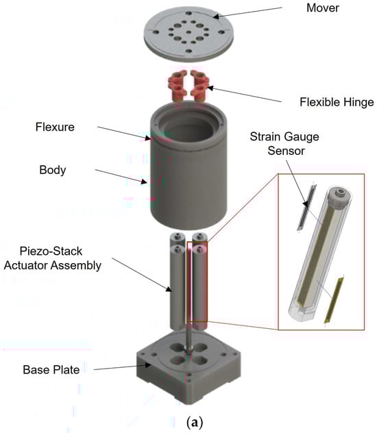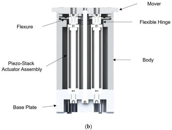 Overview of the piezo-actuated FSM without the optical mirror (which is attached to the mover and operated using two stacked actuators per axis): (a) exploded view; (b) cross-sectional view.